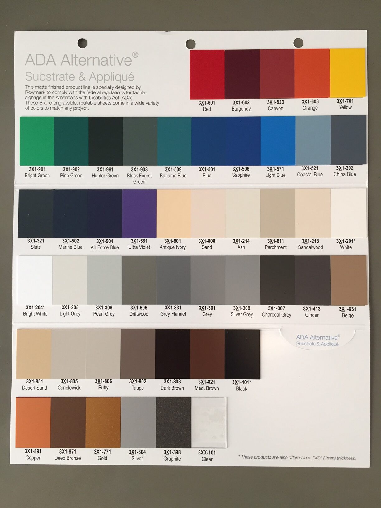 Although we offer the most popular colors for our acrylic inserts online there are others from which to choose. For a complete selection of available colors please reference our ADA Color Chart for both text and background color options. Also, check out our ADA Color Contrast Guide which lists the ADA compliant color combination options available. Custom frame sizes, colors and layouts are available across all of our office sign products.